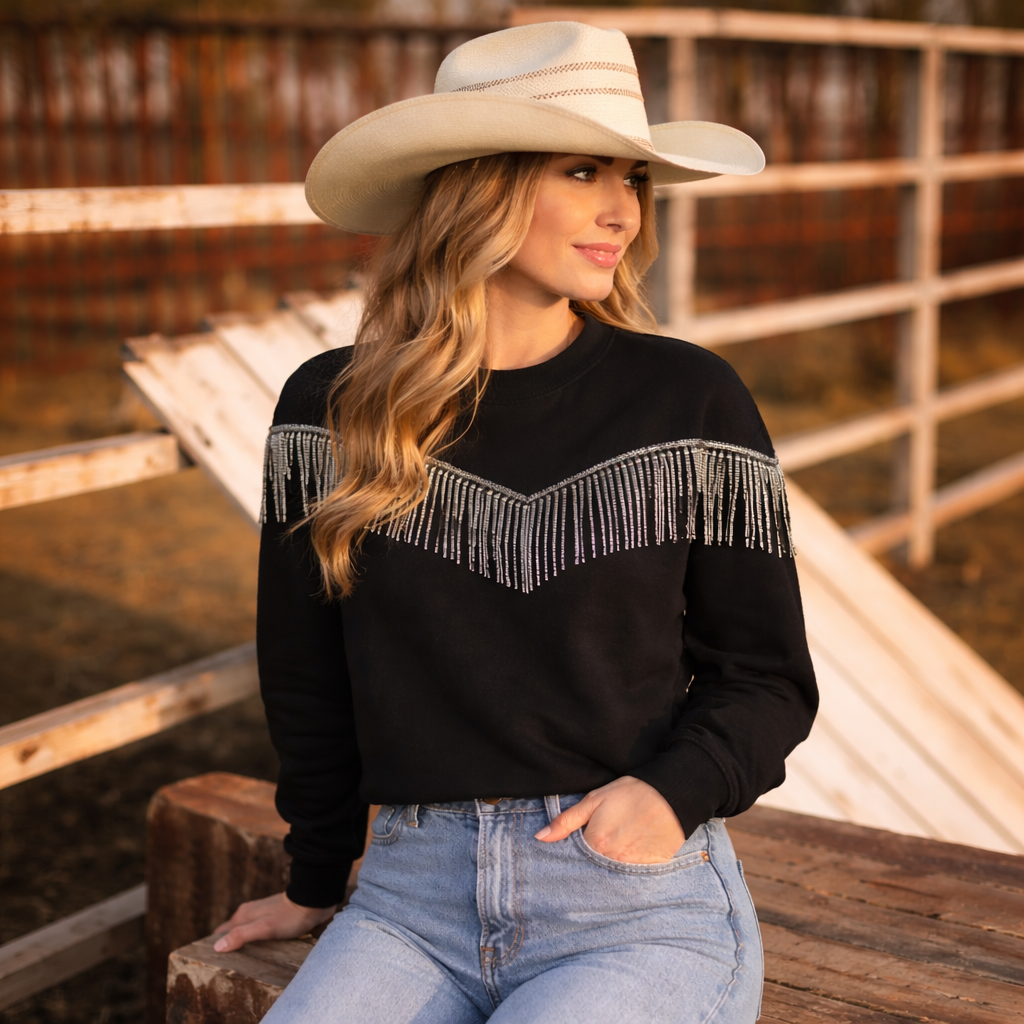 Add a little western edge to your everyday look with this statement fringe sweatshirt. Designed with comfort and style in mind, this top is crafted from a soft, breathable cotton-poly blend that feels cozy while maintaining its shape throughout the day.