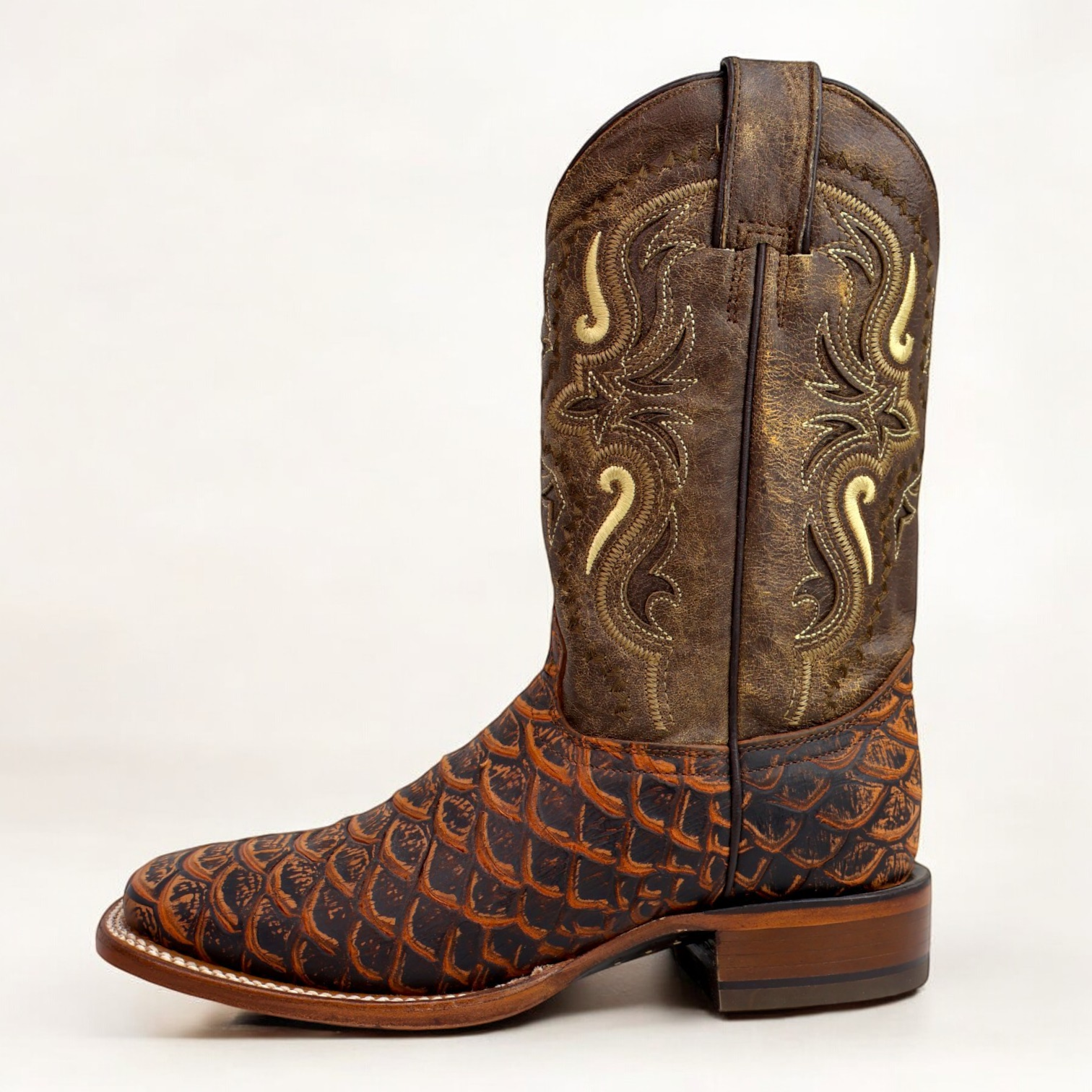 The Caiman Belly Rustic Nubuck Square Toe Boots offer unmatched style with a unique genuine leather caiman belly rustic print. Crafted in Mexico, these boots feature a square toe, double-stitched welt, and leather stacked heels for durability. The full cowhide leather lining and leather interior insole ensure lasting comfort, perfect for any western enthusiast.