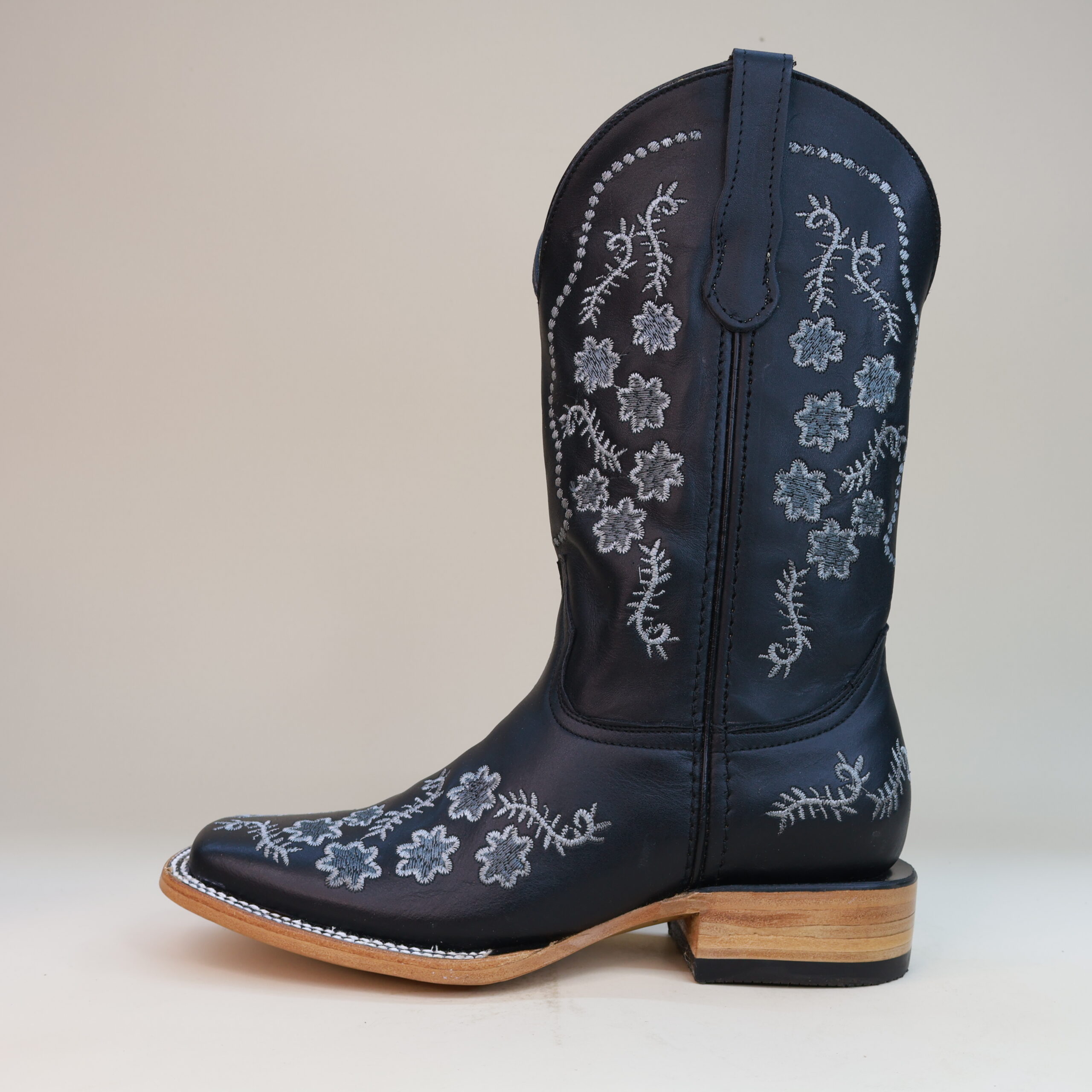 The Floral Embroidered Square Toe Boots in Black are a blend of elegance and durability, featuring intricate floral embroidery. These boots are handcrafted from genuine leather and boast double-stitched welt construction for enhanced longevity. Made in Mexico, they include leather stacked heels, full cowhide leather lining, and leather insoles to ensure comfort with every step.