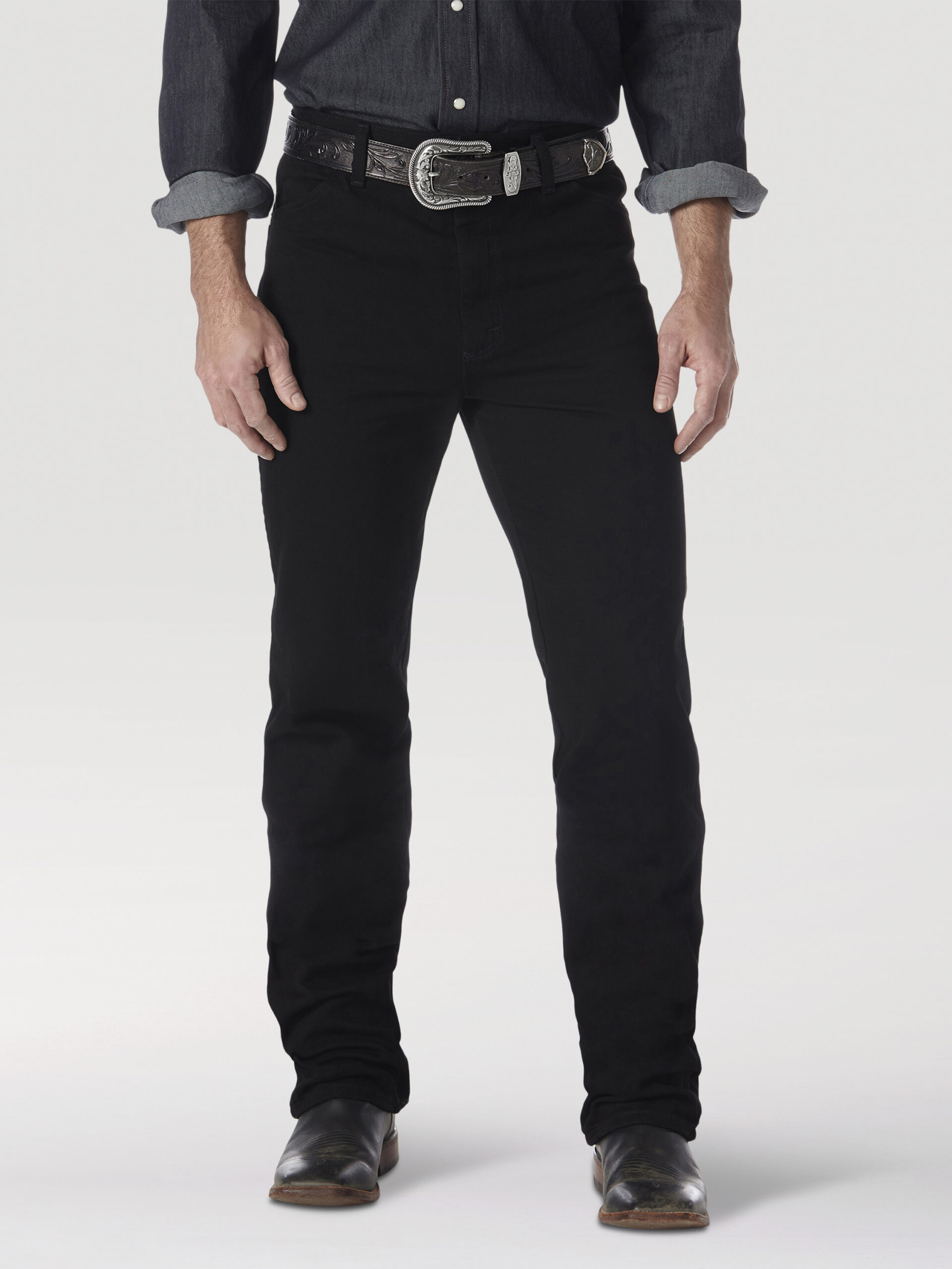 Introducing the Wrangler® Cowboy Cut® Slim Fit Original Black Jeans, a staple for the modern cowboy. Crafted with the iconic Wrangler® Cowboy Cut® design, these jeans are built to meet the demands of those who work hard and play hard. With the same trusted details as the classic 13MWZ, including the signature ‘W’ stitching and neolite patch, this slim fit version offers a sleek silhouette through the seat, thigh, and knee for a sharp, contemporary look.